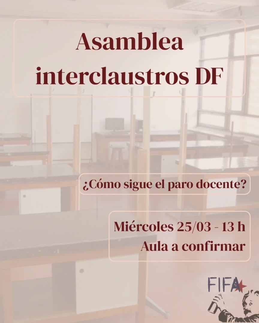 "En el marco del conflicto en defensa de la universidad pública y el sistema científico, invitamos a la comunidad del Departamento de Física a participar de una nueva asamblea interclaustros para realizar un balance colectivo de la situación actual y definir las medidas a seguir en las próximas semanas.